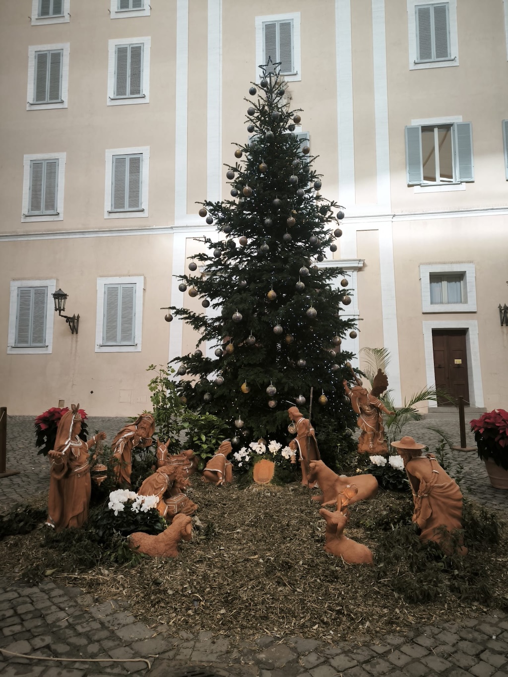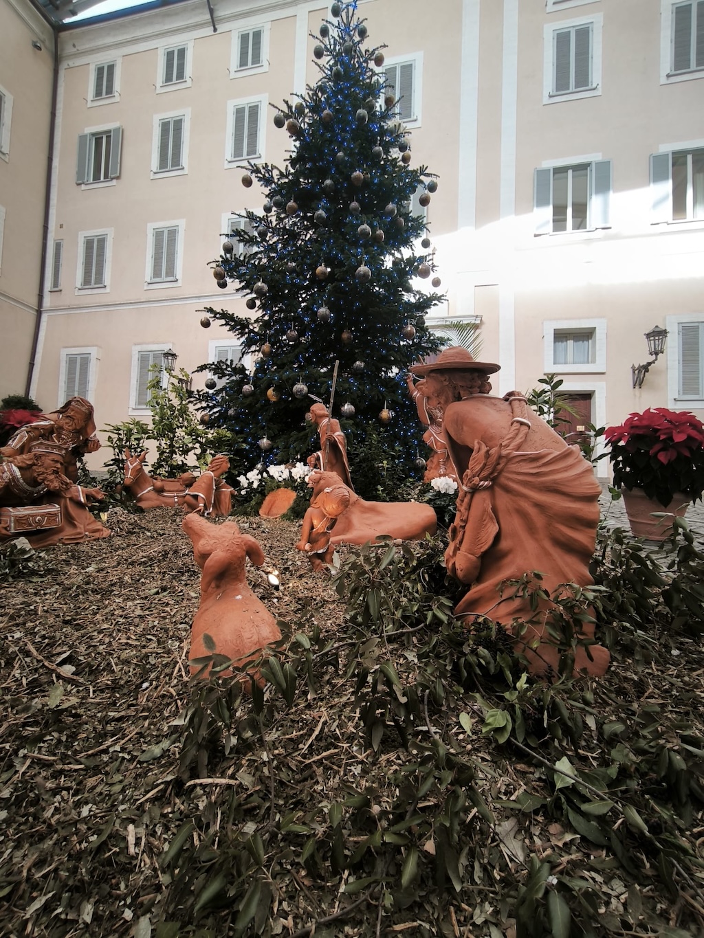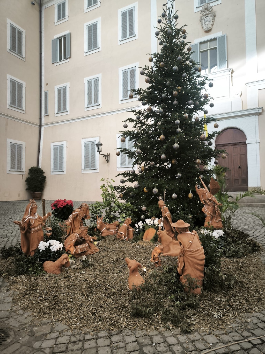 Un’esplosione di calore, fede e tradizione popolare, intorno al grande albero di Natale, collocato al centro del Cortile del Palazzo Apostolico di Castel Gandolfo. Figure modellate a mano in terracotta ricordano la nascita di Gesù. Si tratta di un presepe messicano, con un numero di personaggi essenziale: il Bambino, Maria, Giuseppe, i tre Magi, un pastore e un angelo. Hanno forme semplici ma molto espressive: volti assorti a contemplare il mistero, tutti protesi verso la mangiatoia circondata dal bue e l’asinello.
