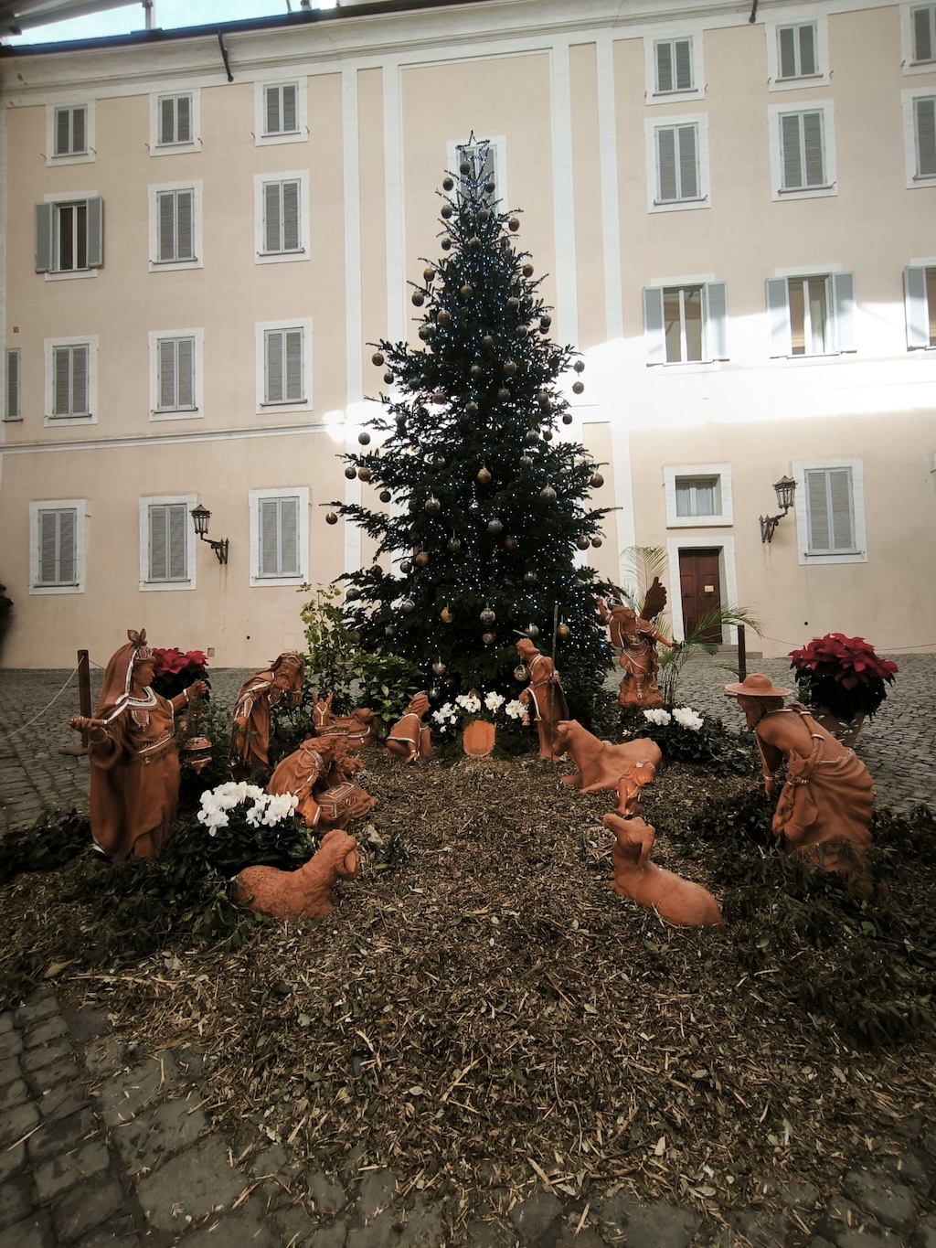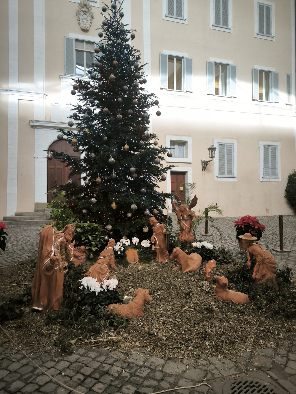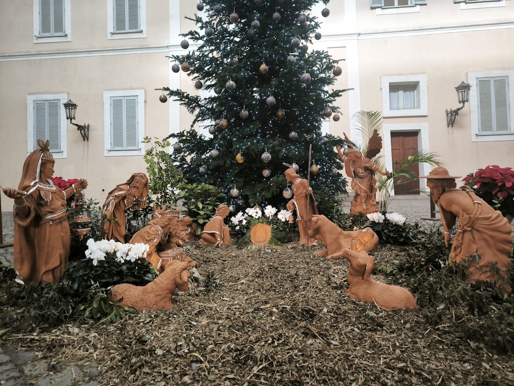 Un’esplosione di calore, fede e tradizione popolare, intorno al grande albero di Natale, collocato al centro del Cortile del Palazzo Apostolico di Castel Gandolfo. Figure modellate a mano in terracotta ricordano la nascita di Gesù. Si tratta di un presepe messicano, con un numero di personaggi essenziale: il Bambino, Maria, Giuseppe, i tre Magi, un pastore e un angelo. Hanno forme semplici ma molto espressive: volti assorti a contemplare il mistero, tutti protesi verso la mangiatoia circondata dal bue e l’asinello.